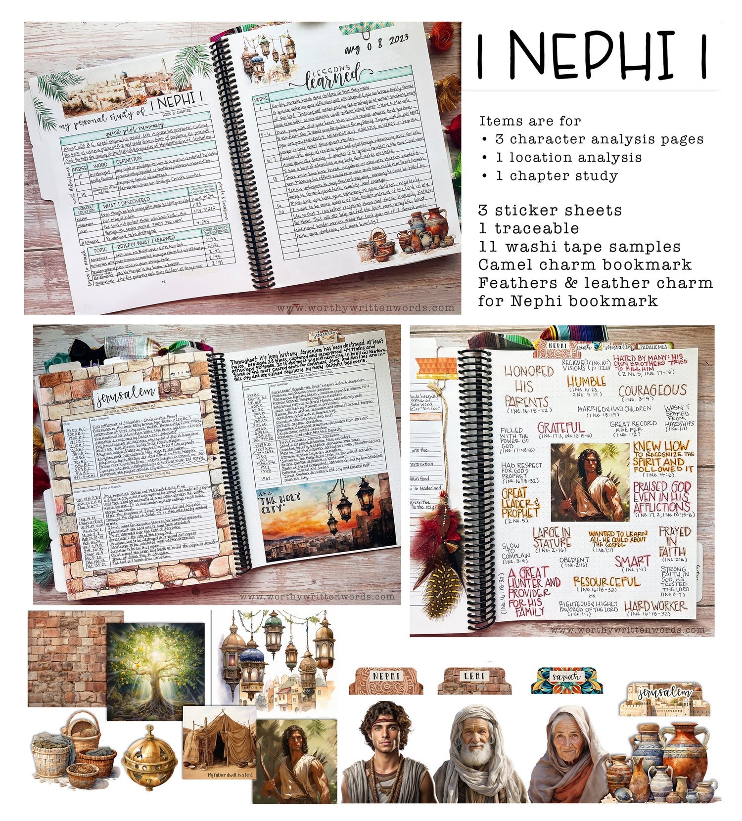 Everything you need to thoroughly study 1 Nephi 1. These items were designed to be used in our Creative Book of Mormon Study Journal but will also work in wide margin scriptures. This packet includes stickers and embellishments that will help you study 3 characters, (Nephi, Lehi, and Sariah) the location of Jerusalem, as well as 1 Nephi 1 in general.