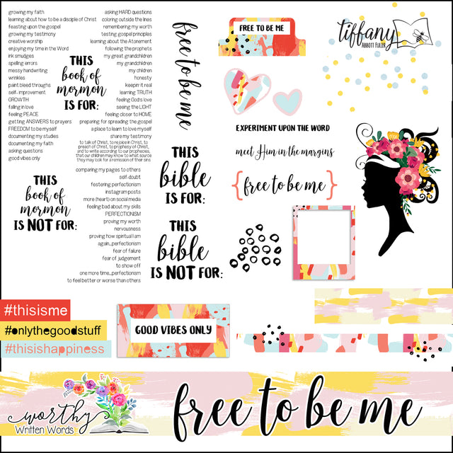 Do you ever feel paralyzed to start journaling in a book of scripture for fear of messing up? Perfectionism can stop our growth. "Free To Be Me", imagined by Tiffany Fuller and designed by Aimee White, puts our priorities in order. It allows you to be okay with ink smudges, paint bleed throughs, and imperfections. Designed to be printed on sticker paper and/or cardstock and placed within the first few pages of your book. Get over your fears and get started today! Available in two sizes, small for standard size scriptures and large for very large books. You can always get the large and shrink it in your printer settings if you aren't sure which is best for you.