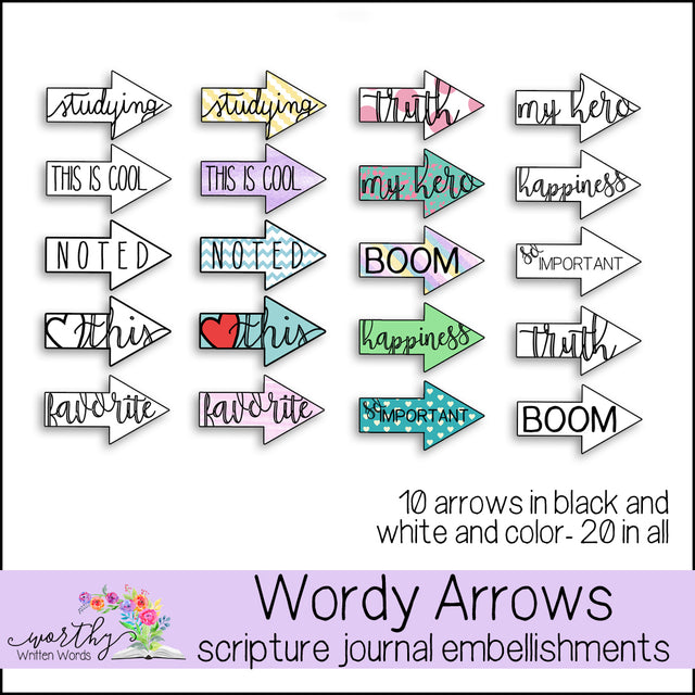 10 different arrows in color and black and white, 20 in all. Print, cut, and paste into your scripture journal or scriptures. Comes in PDF format. Due to the nature of digital files no refunds can be given. For personal use only.