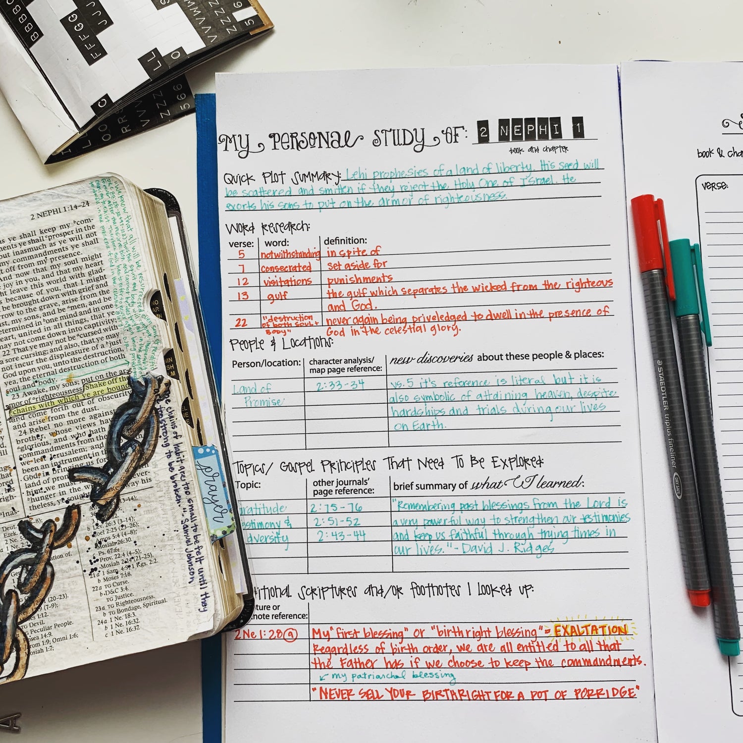 This printable template helps guide your chapter by chapter studies in your scriptures. It outlines all that you researched and learned from your reading including the book and chapter, quick plot summary, word definitions, people and places, topics that need further research, and additional footnotes or scriptures looked up. Comes in .pdf format and is available for immediate download in sizes 8.5X11, 7X10, or Planner size A5. Because of the nature of digital files no refunds can be given. This template is also part of the Chapters Kit. For personal use only.
